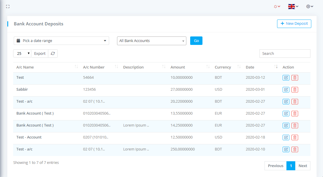 To view Bank Account Deposits List go to Banking & Transactions-> Bank Account Deposits where you can see all the bank account deposit details with filtering options and can download the list as PDF or CSV file by clicking on Export button.