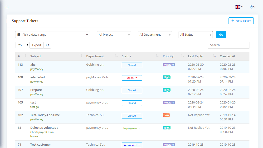 To see the Support Tickets List with filtering options click on the Support from left side bar. You can download the list as PDF or CSV file by clicking on Export button. And can change any status to Closed.