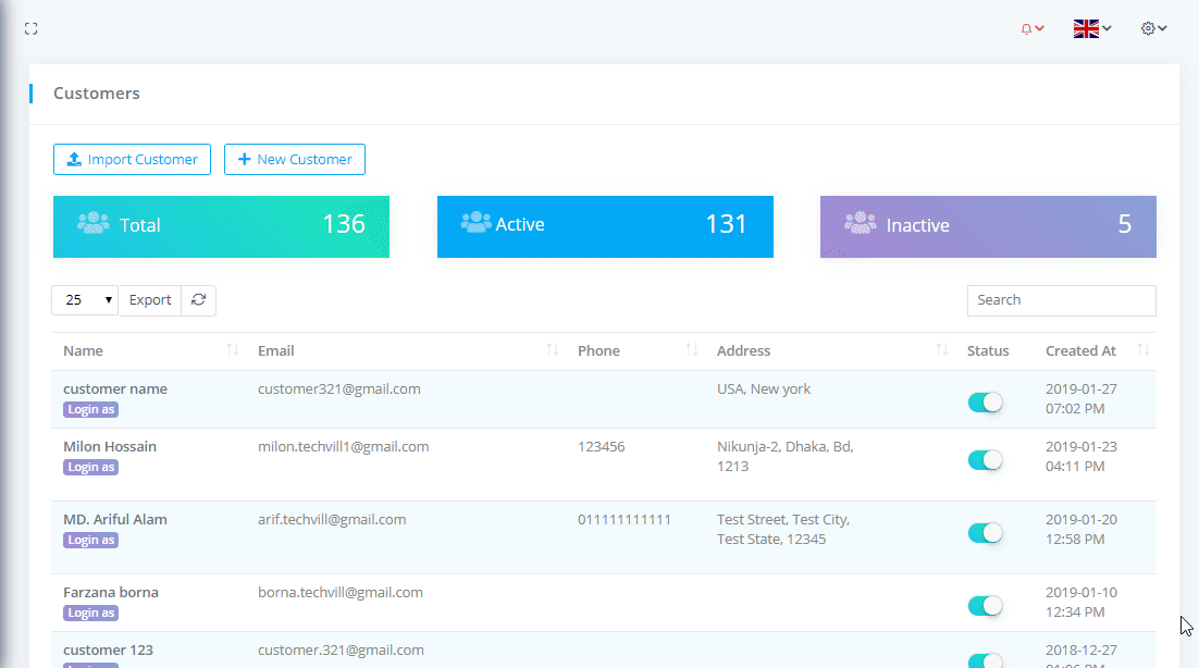 To view Customers List go to Relationships-> Customers where you can see the all Customers nd can download the list as PDF or CSV file by clicking on Export button. You can also see the Total Customers with Active and Inactive customers.