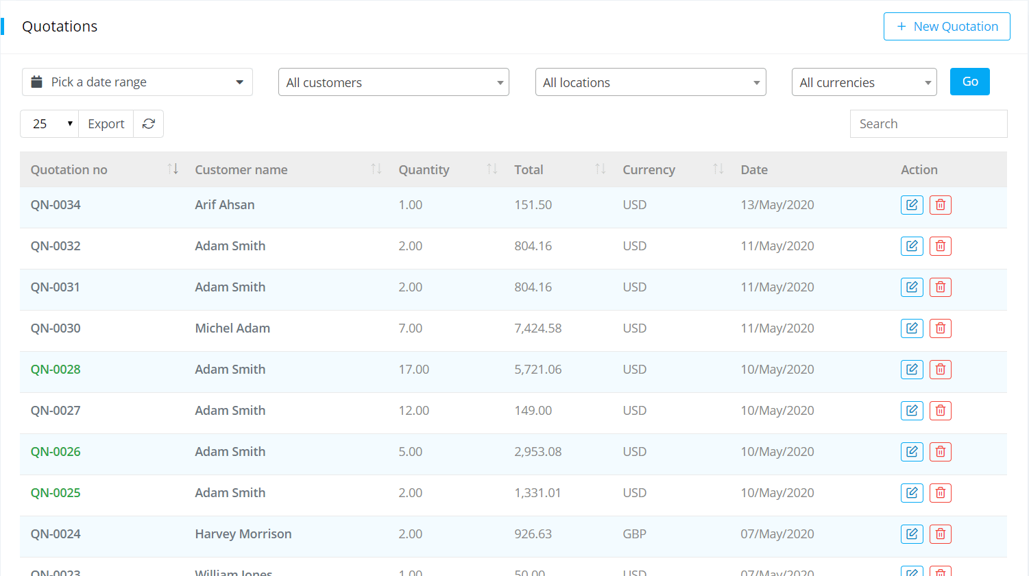 To manage quotations, click Sales -> Quotations from left sidebar. After that quotations list will appear. From here you can add, edit and delete any quotation.