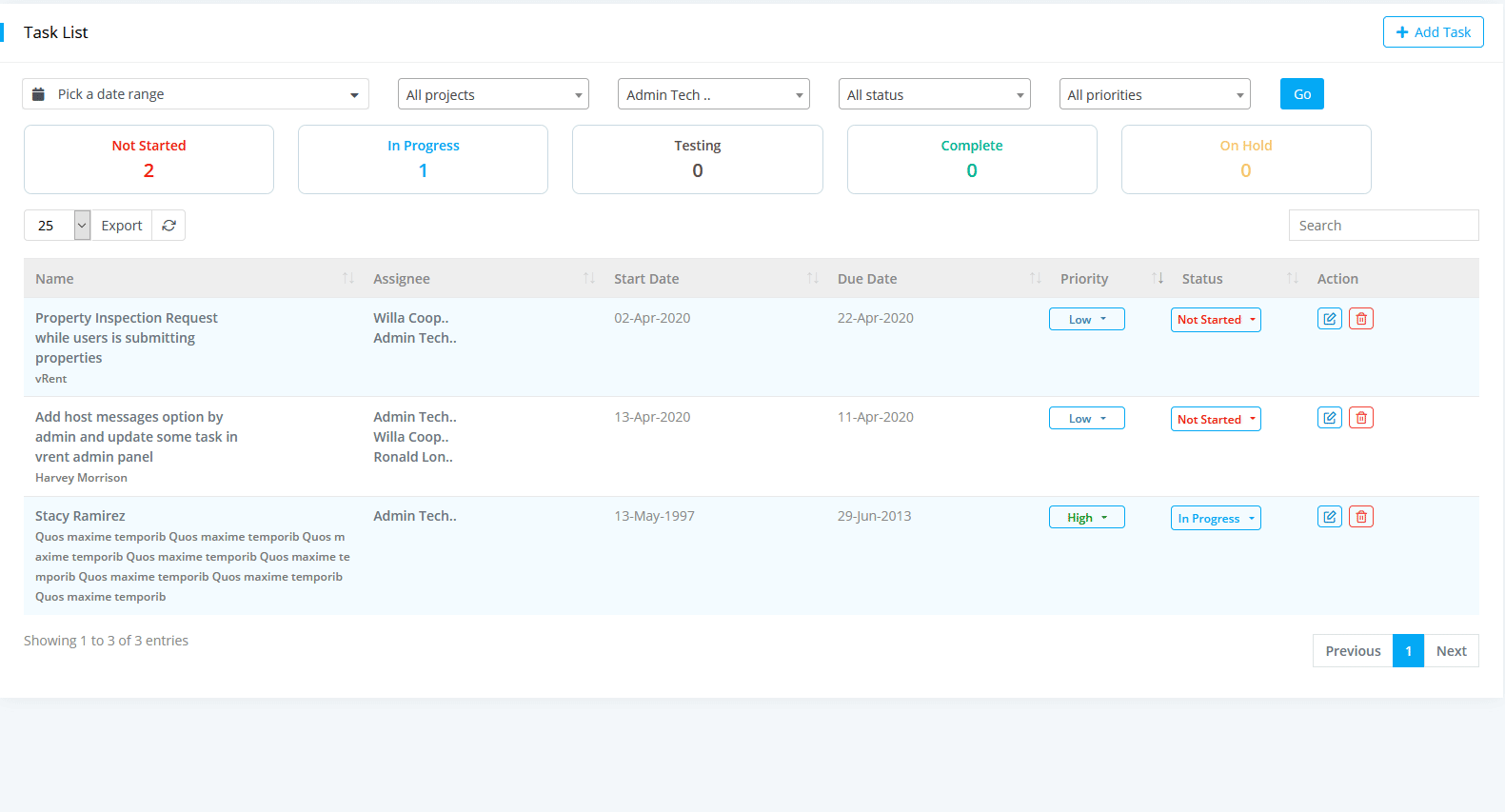 For Edit or Delete a task click on the Tasks from left side bar after that click on Action column edit and delete icon button from the list.
