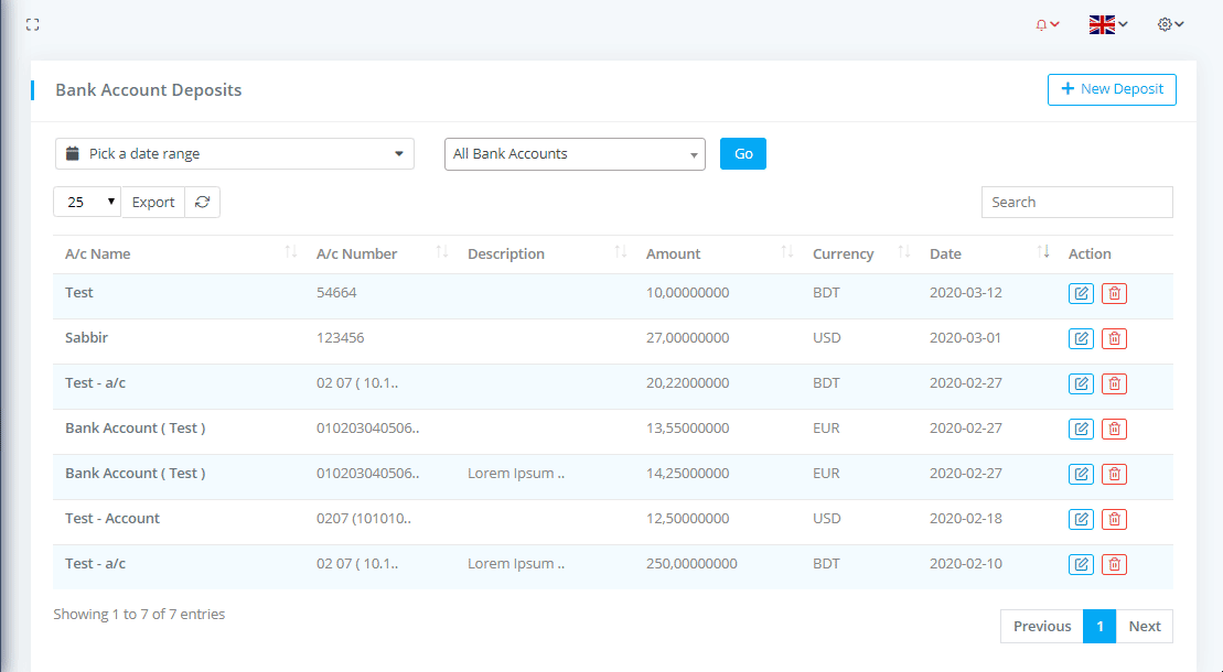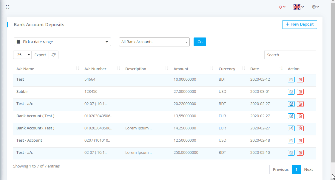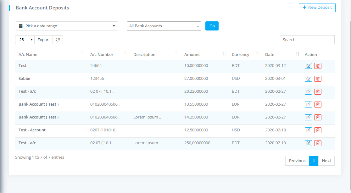 To view Bank Account Deposits List go to Banking & Transactions-> Bank Account Deposits where you can see all the bank account deposit details with filtering options and can download the list as PDF or CSV file by clicking on Export button.