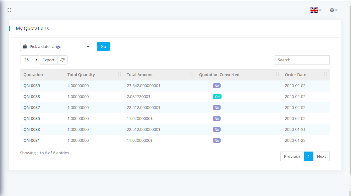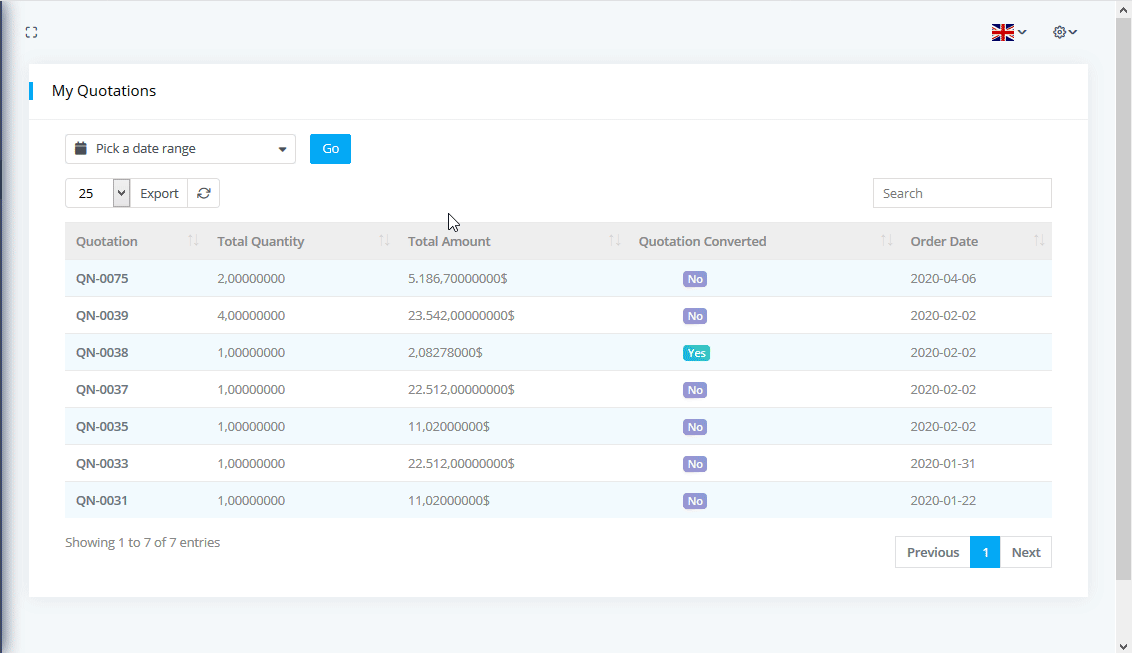 To see the Quotations List with filtering options click on the Quotations from left side bar. You can download the list as PDF or CSV file by clicking on Export button.