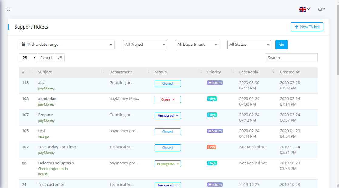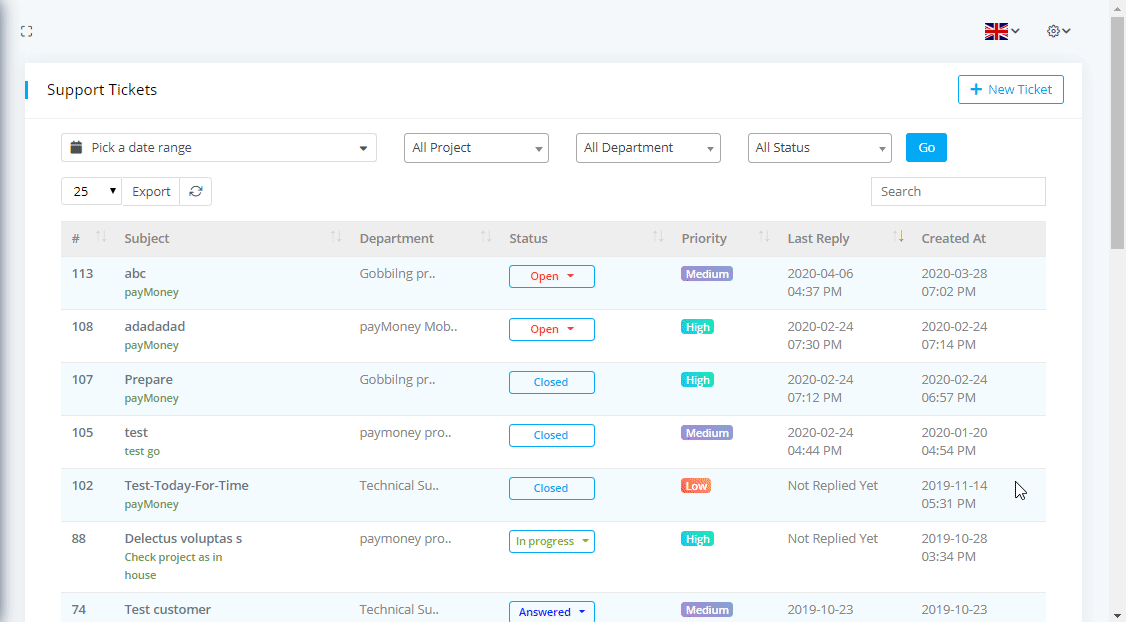 To see the Support Tickets List with filtering options click on the Support from left side bar. You can download the list as PDF or CSV file by clicking on Export button. And can change any status to Closed.