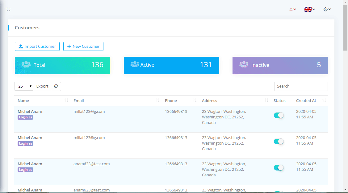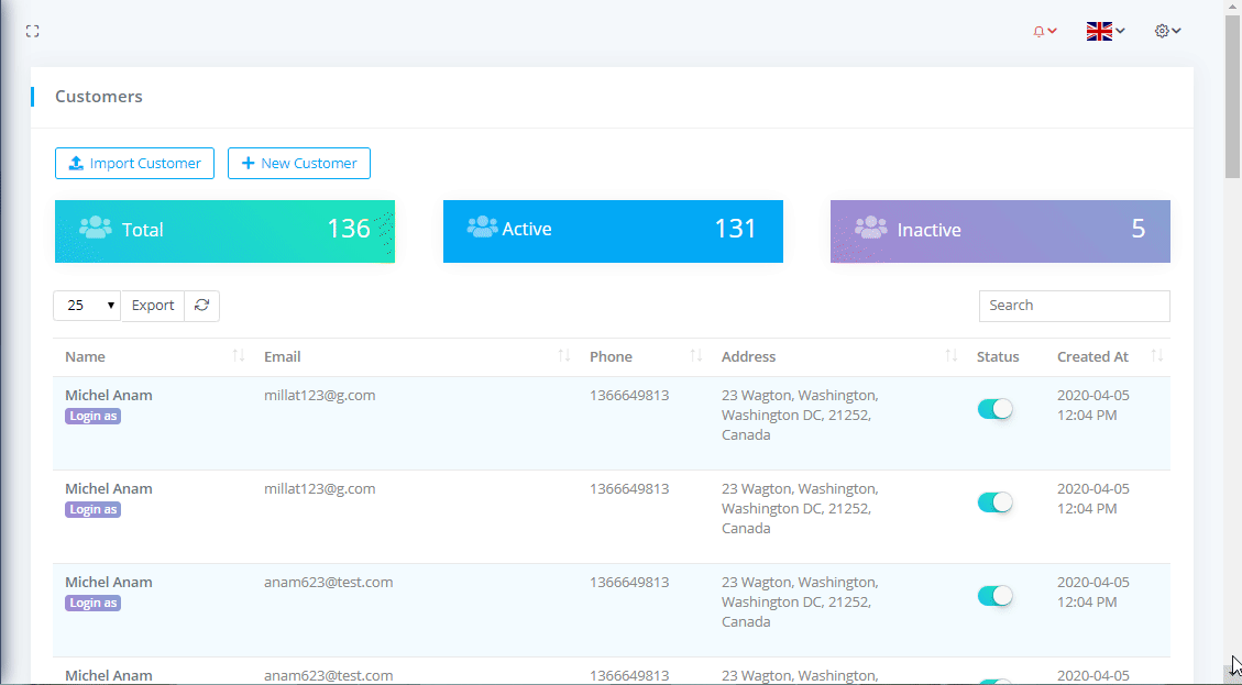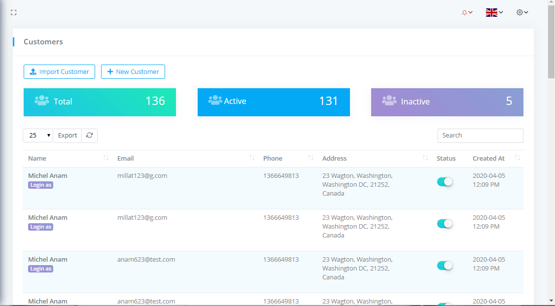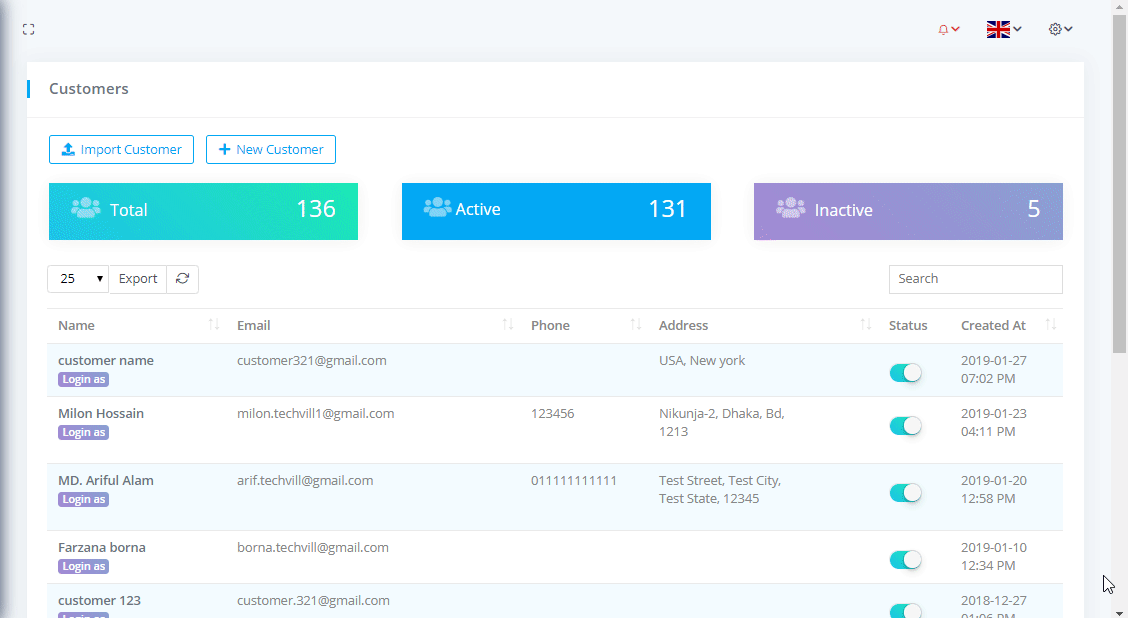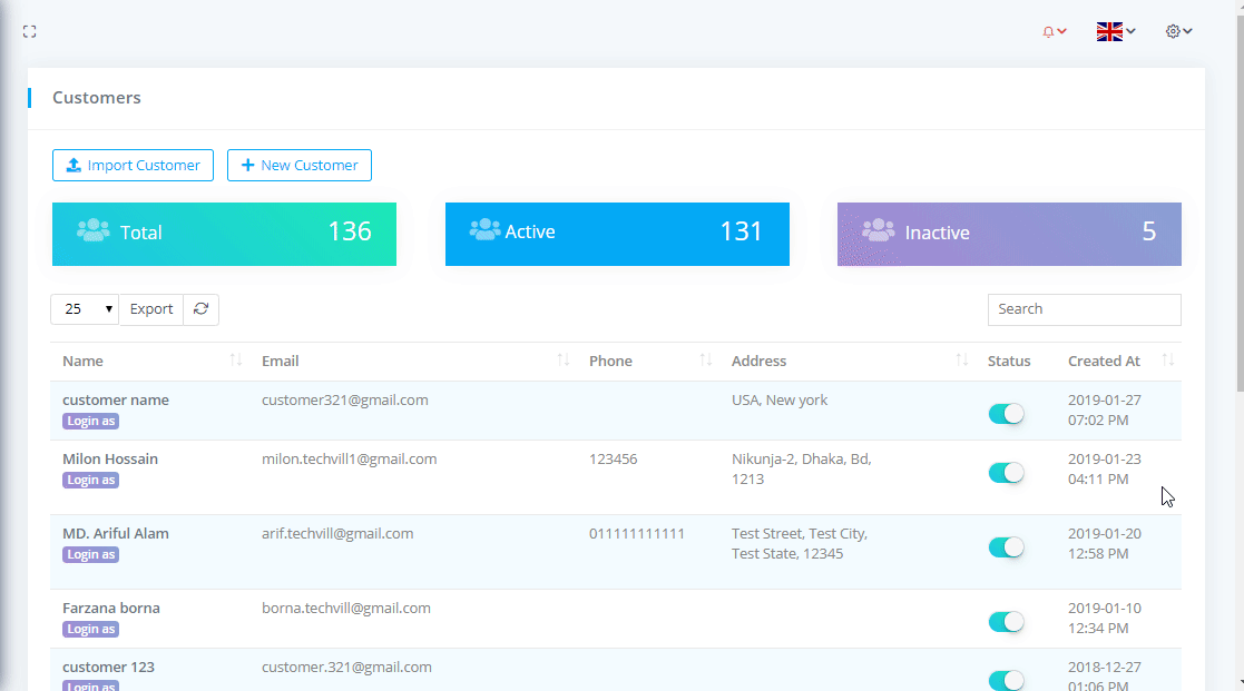 To view Customers List go to Relationships-> Customers where you can see the all Customers nd can download the list as PDF or CSV file by clicking on Export button. You can also see the Total Customers with Active and Inactive customers.