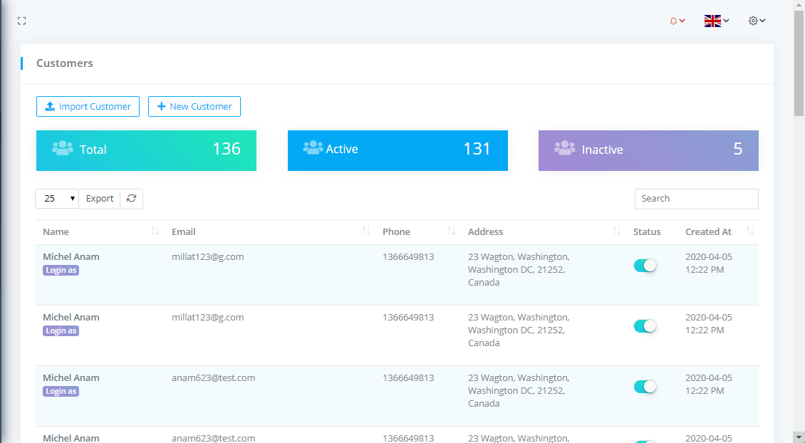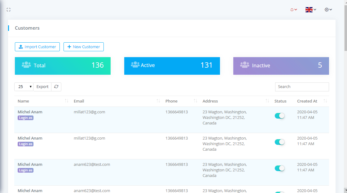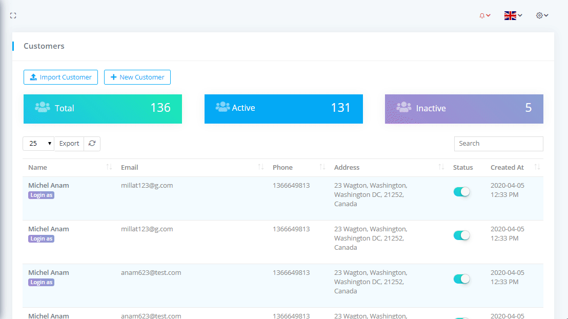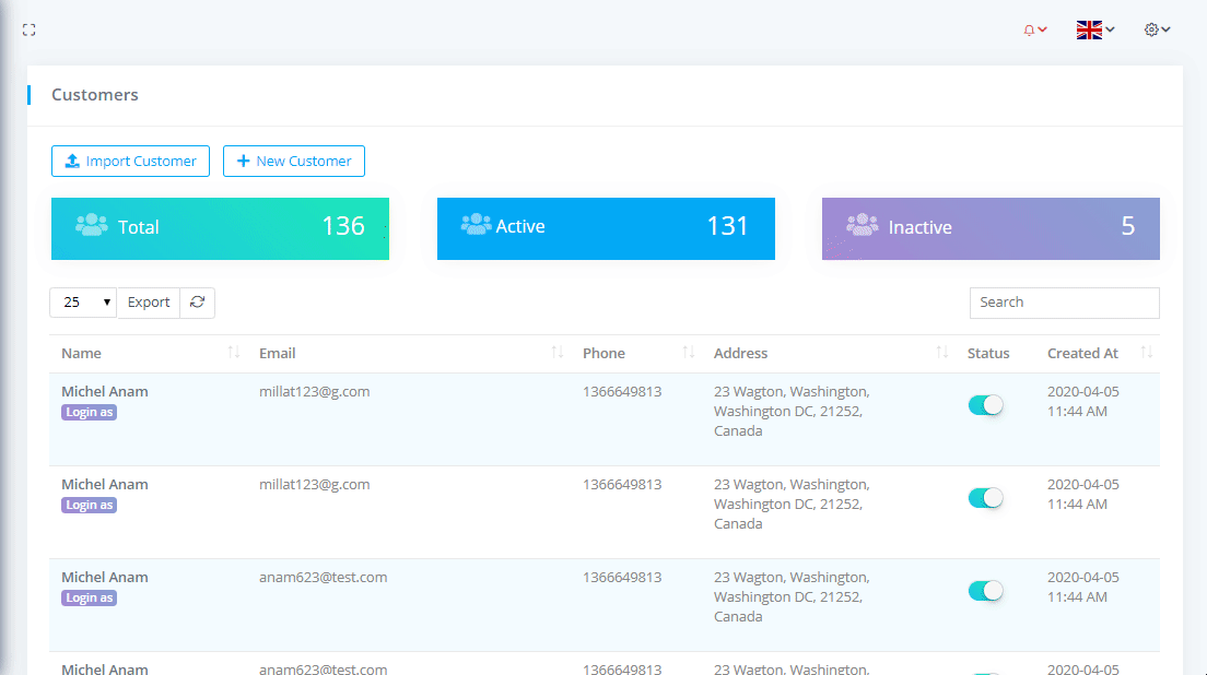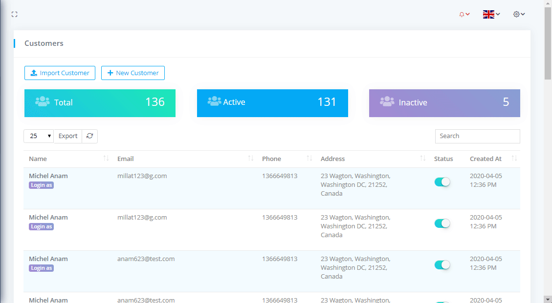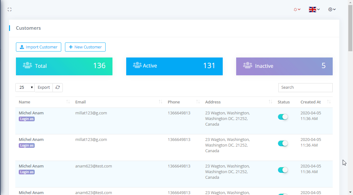 To view Customers List go to Relationships-> Customers where you can see the all Customers nd can download the list as PDF or CSV file by clicking on Export button. You can also see the Total Customers with Active and Inactive customers.