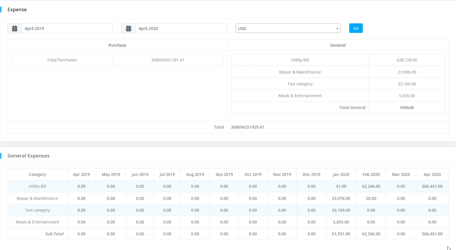 In expenses report, the expenses are splited into two section they are Purchase and General. You will see the total purchase costs and categorywise general expense costs in the top and a detail will be given below.