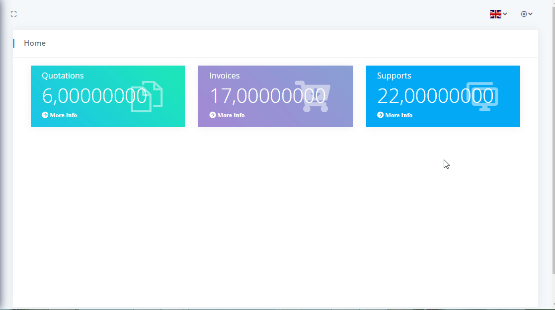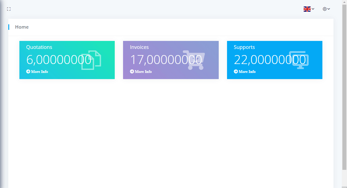 Here you can see the total number of Quotations, Invoices and Supports and also see the list of Quotations, Invoices and Supports by clicking into More Info button.