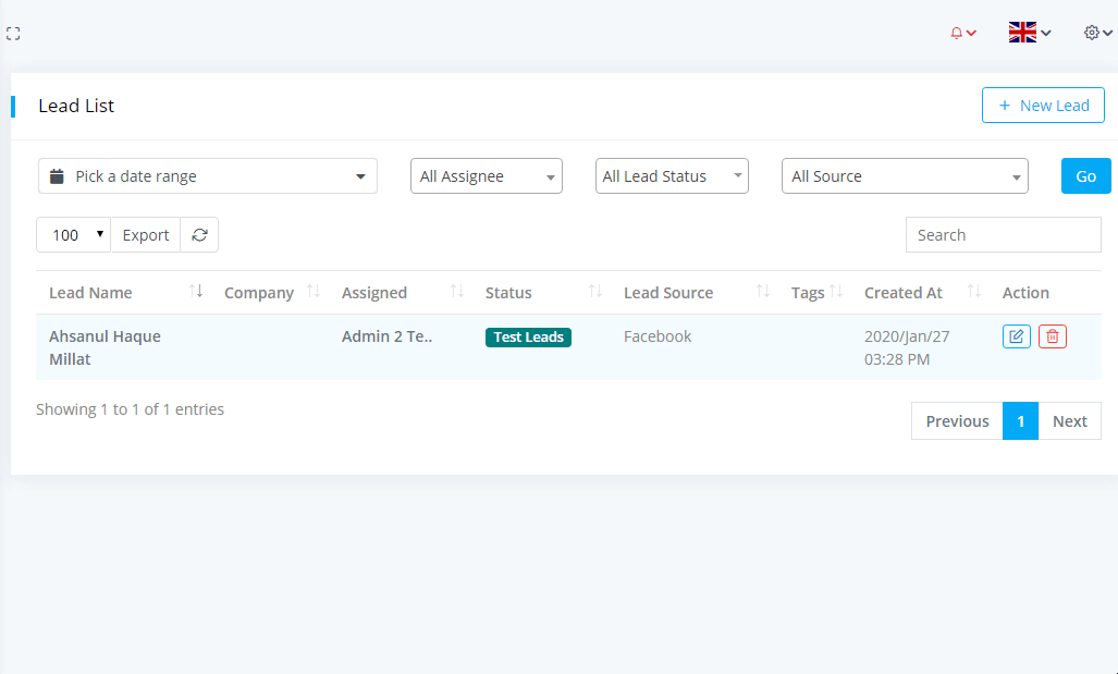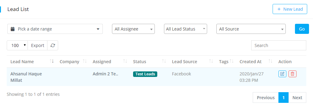 To manage Leads, click Leads from left sidebar. After that a lead lists will come with filter option, from here you can add, edit and delete lead.