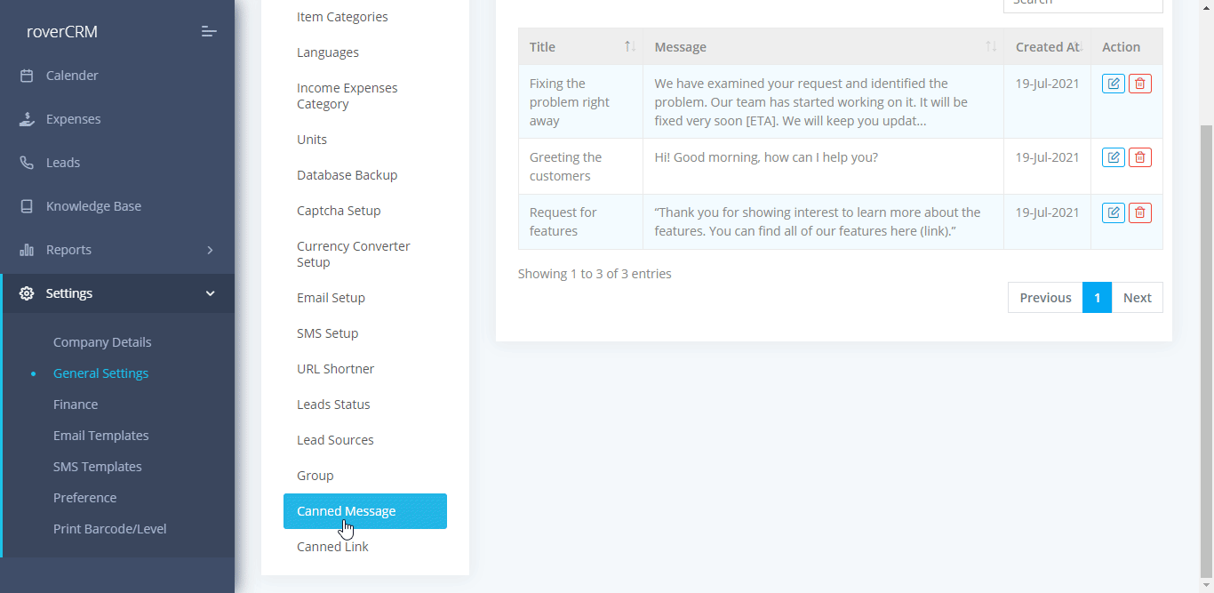 To manage Canned Message, go to Settings > General Settings > Canned Message. In Canned Message, you can add, edit and delete Canned Message.