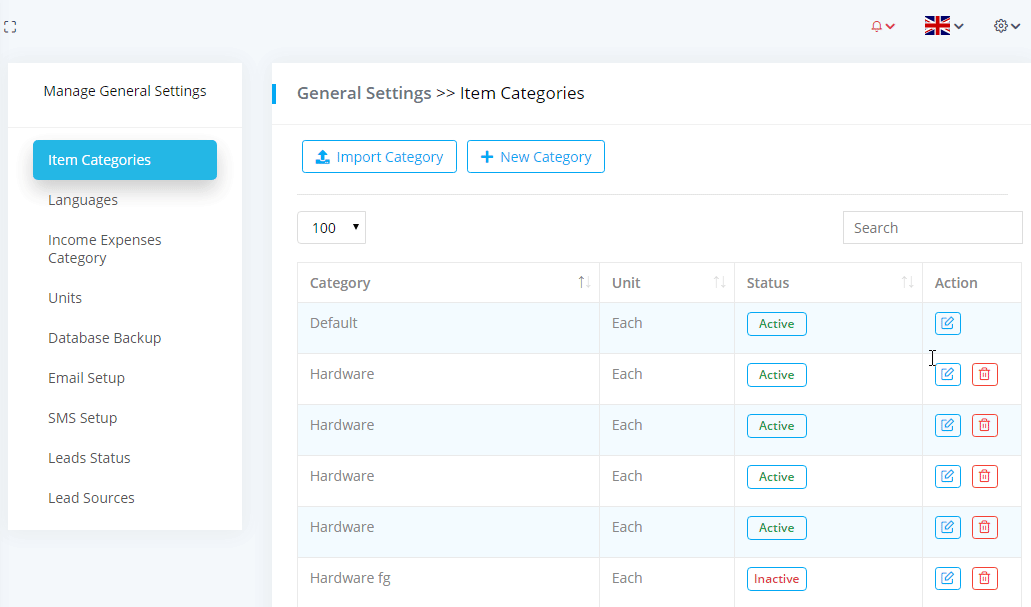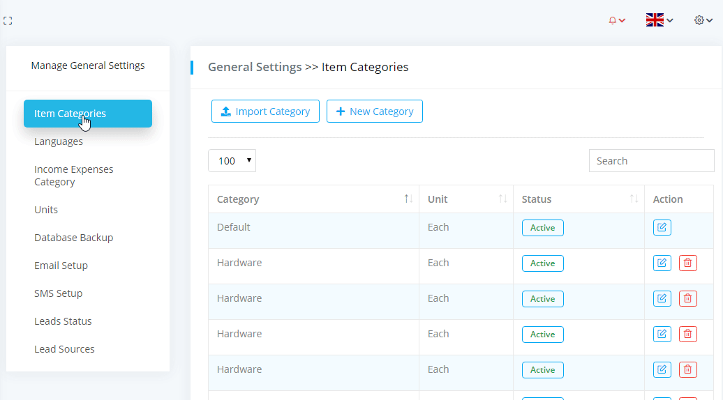 To manage item categories, go to Settings > General Settings > Item categories. In item categories you can add, edit and delete categories.