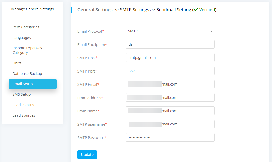 To config SMTP you have to follow the following procedure. You will need to setup SMTP settings for your general email account that all emails from this system will be sent. To setup SMTP Configuration put the necessary valid info for configuration.