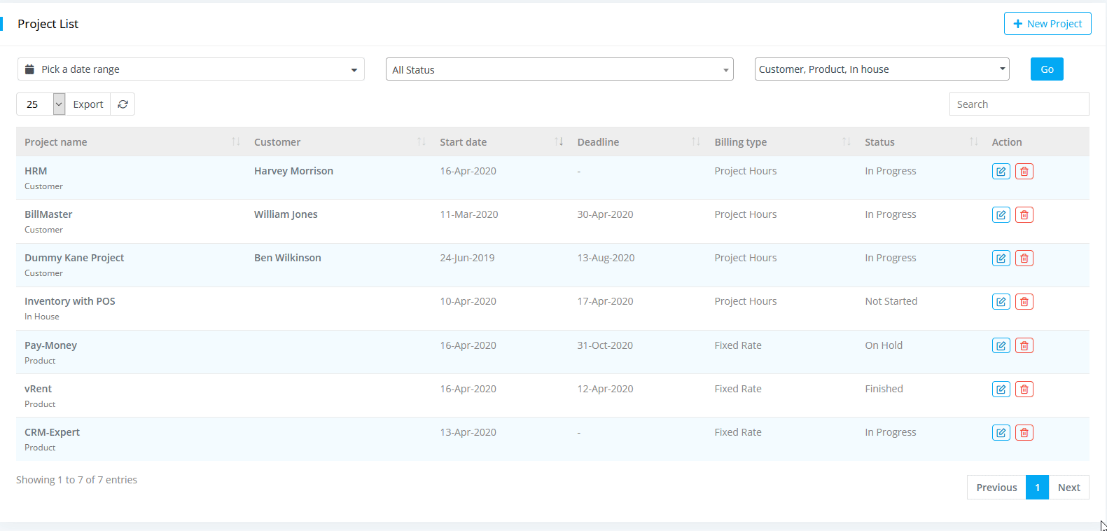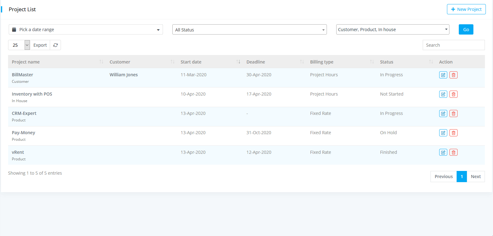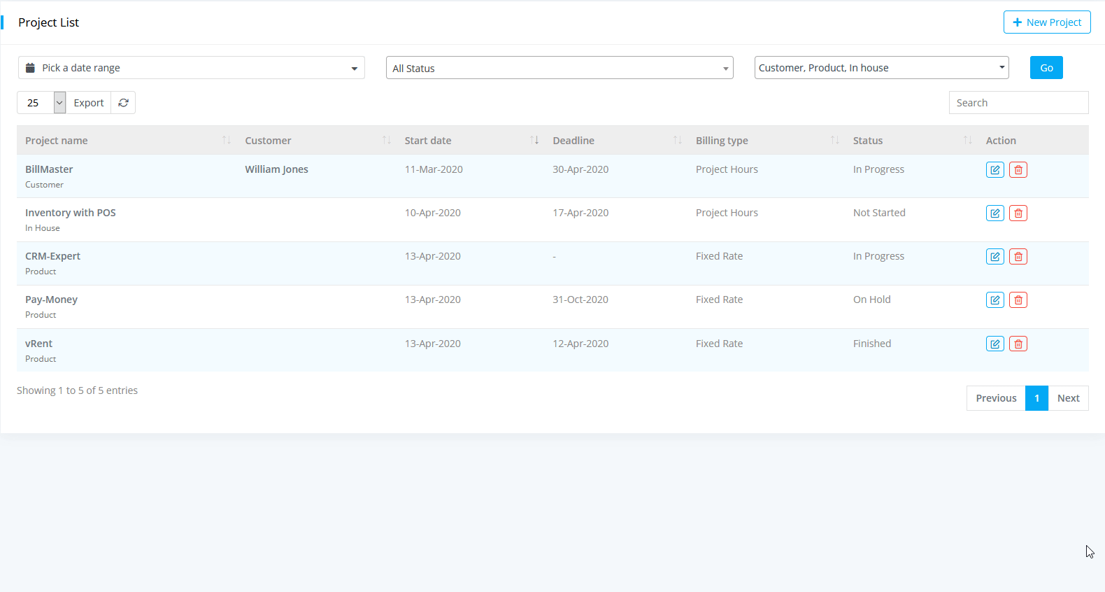 To manage Projects, click Projects from left sidebar. After that a project lists will appear with filter option, from here you can add, edit and delete lead.