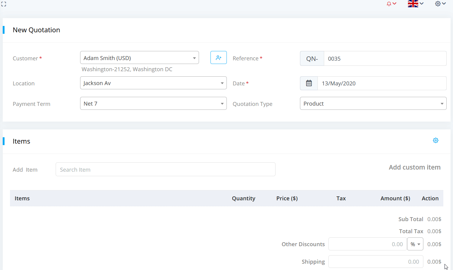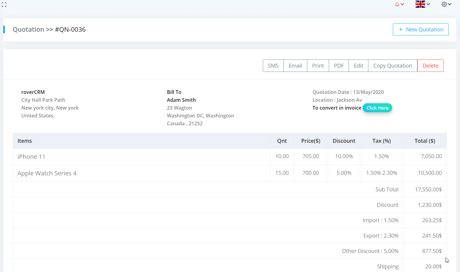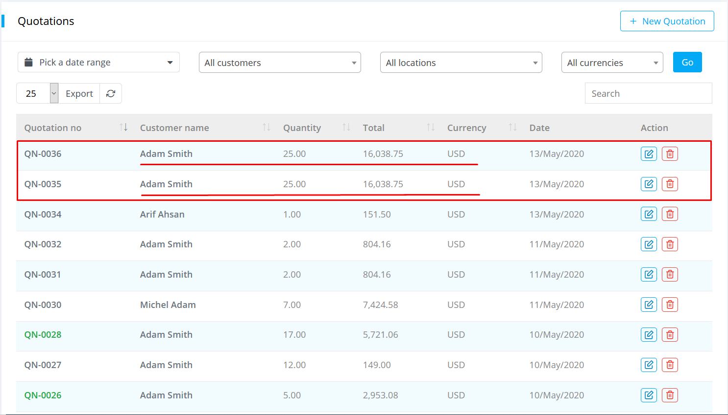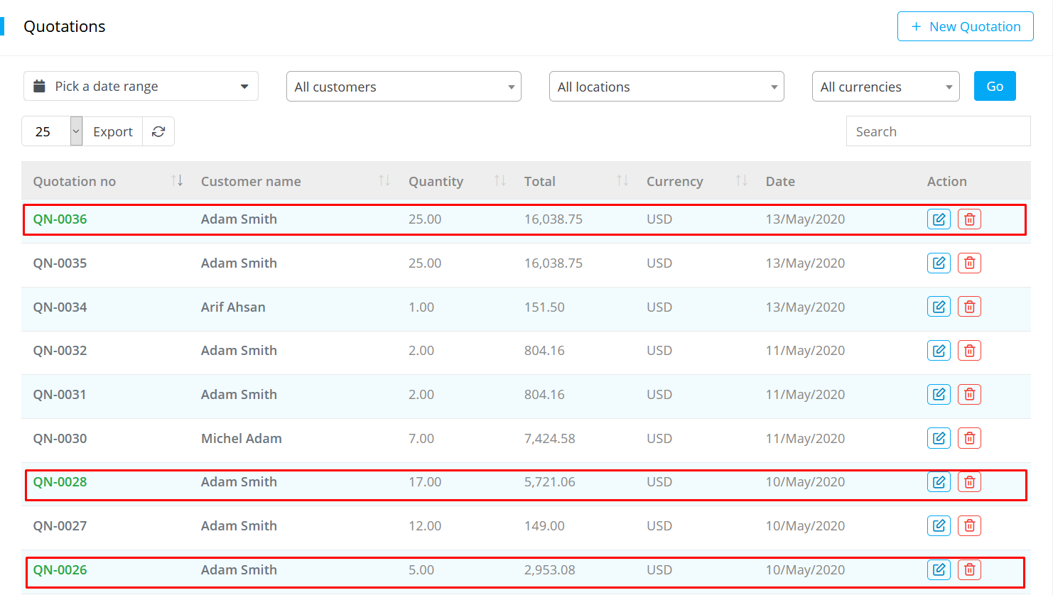 To manage quotations, click Sales -> Quotations from left sidebar. After that quotations list will appear. From here you can add, edit and delete any quotation.