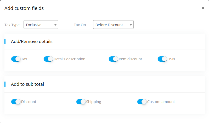 Tax Exclusive: The item amount doesn't include tax. Tax is added separately include to invoice.