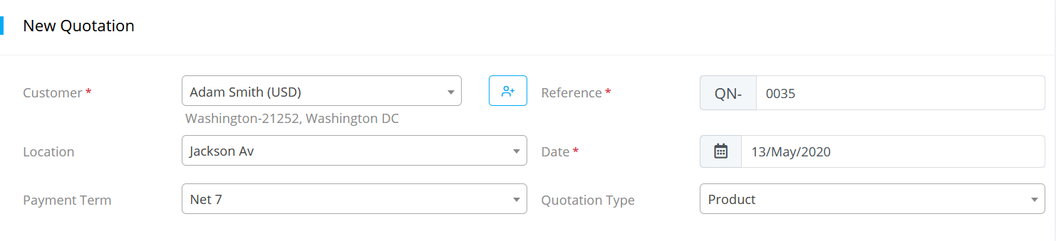 Select Reference, Location, Date, Payment Term, Quotation Type.