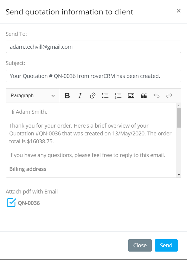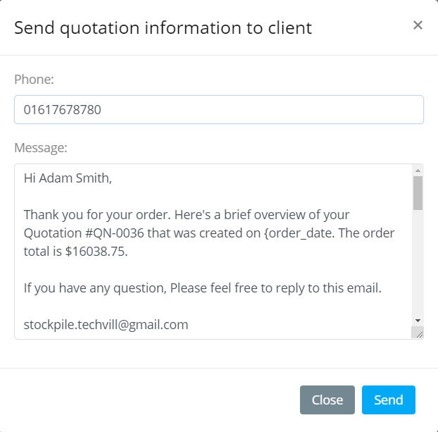 After creating the quotation, select the quotation. On the right side of quotation Email button will be shown. Click on the Email/SMS button, an Email/SMS template window will be opened.