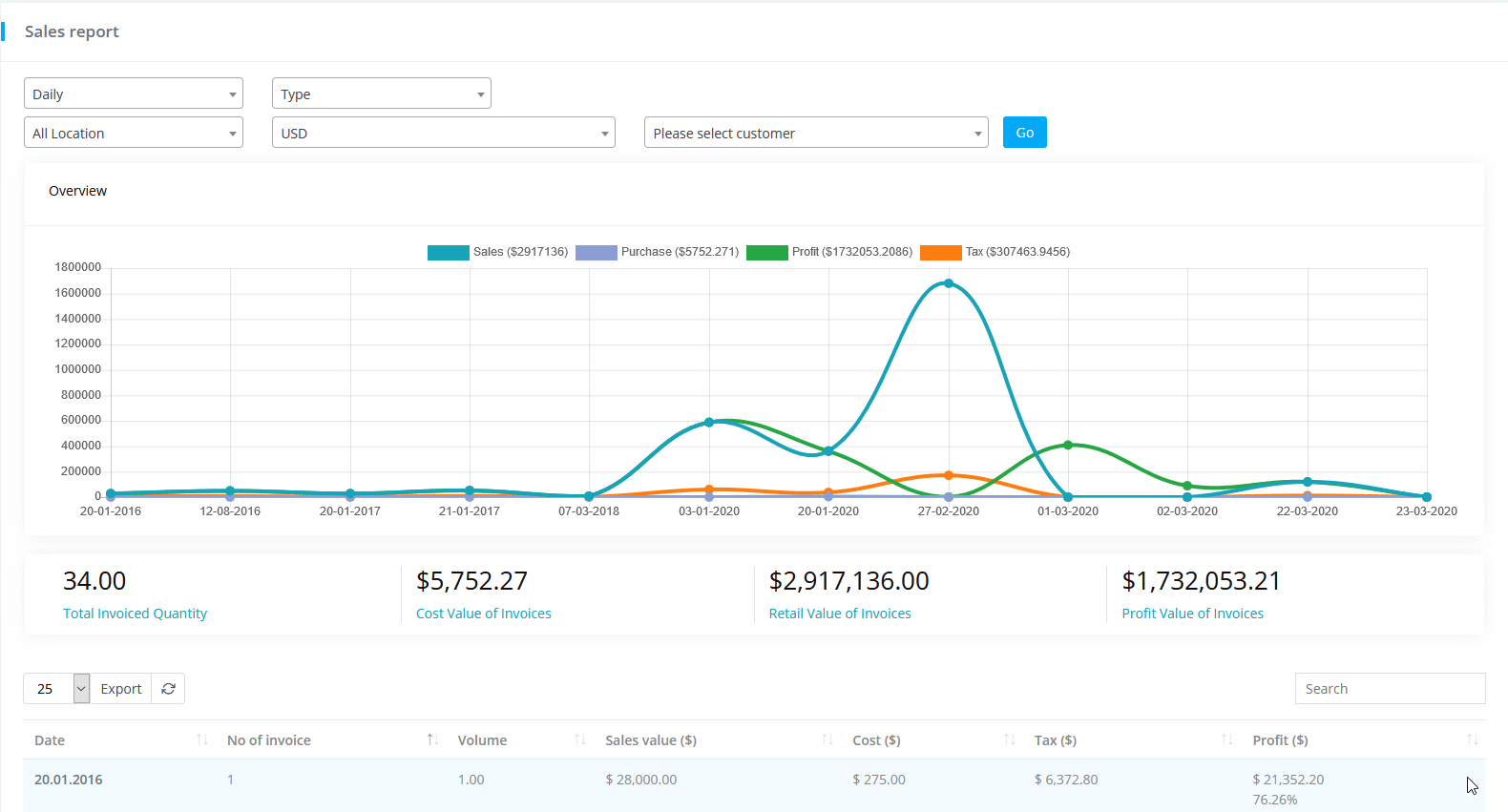 This report is generated from sale invoices. Initially all the data are filtered by last one year sale transactions. Here you can see the report of daily, monthly, yearly and custom filtered transactions.