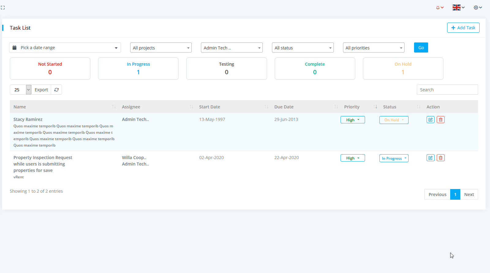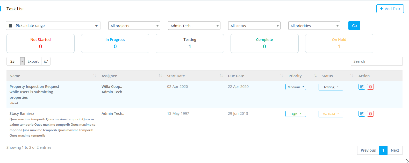 For Edit or Delete a task click on the Tasks from left side bar after that click on Action column edit and delete icon button from the list.