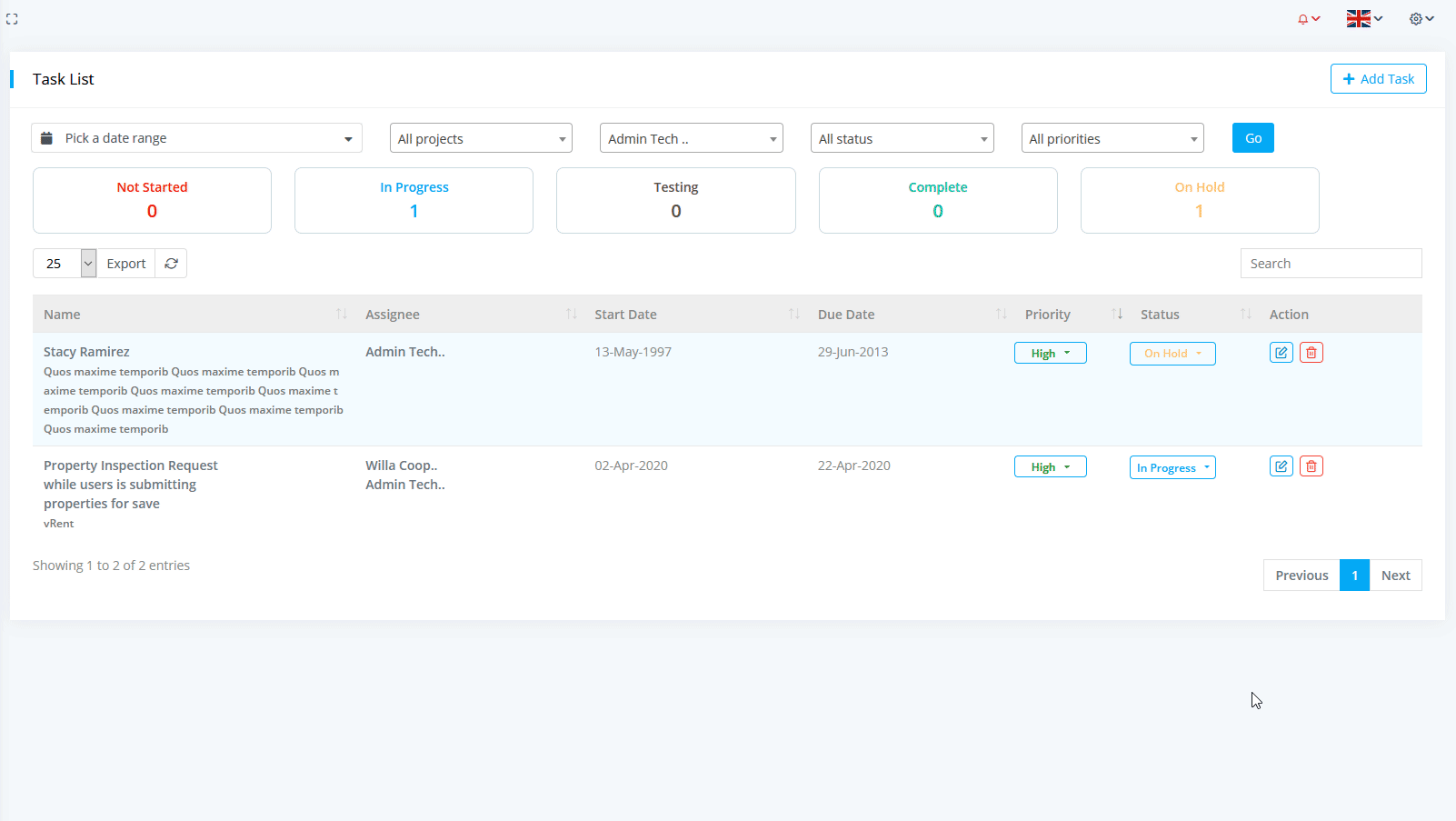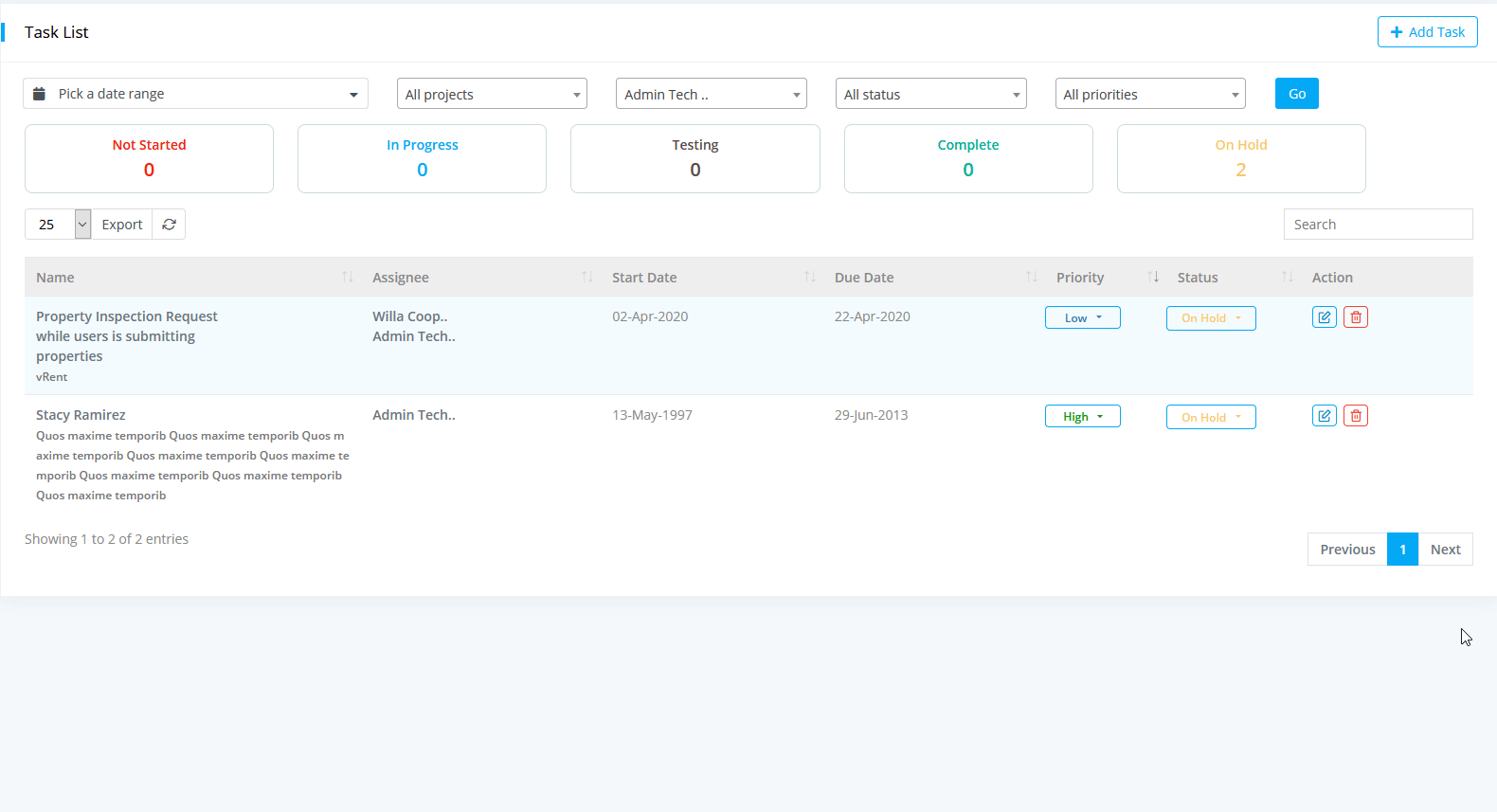 To see the all Tasks with filtering options click on the Tasks from left side bar. You can download the list as PDF or CSV file by clicking on Export button.