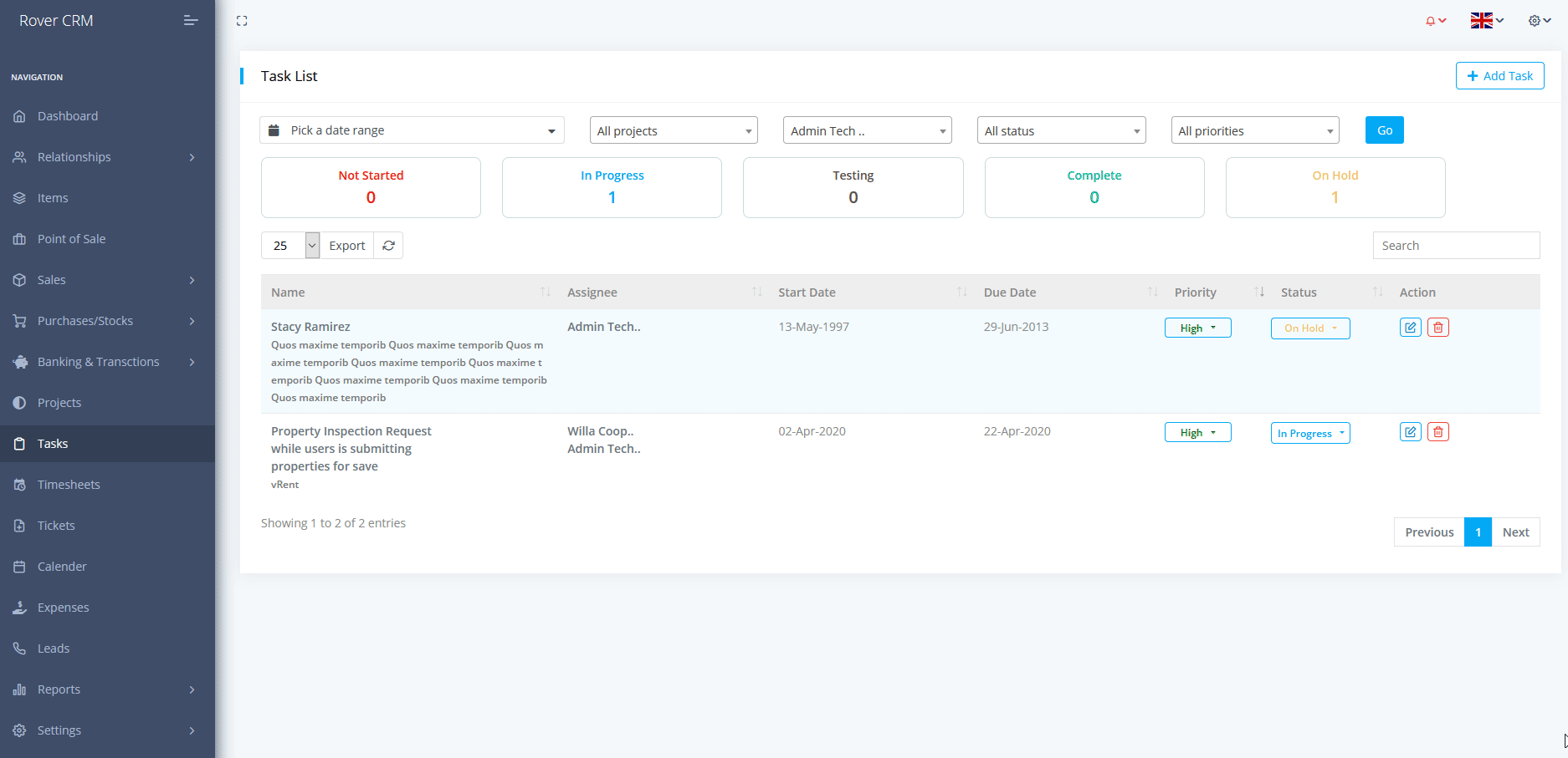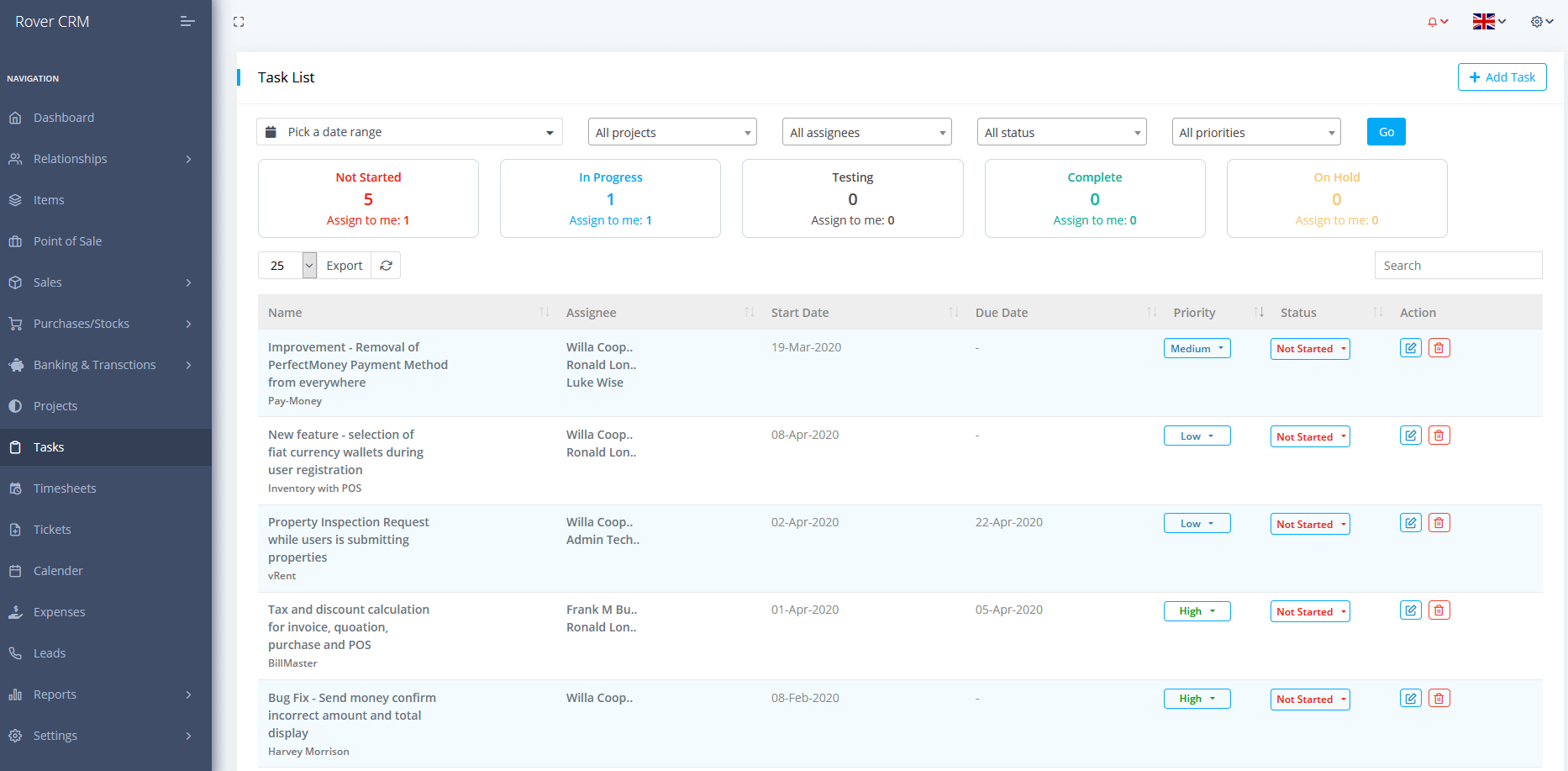 It is one of the effective feature of this CRM. You can add task for customer, project and ticket. You will find those tasks list in Tasks panel as well as in Customer which is under Relationships panel and also in Project panel. Here you can assign a task to single or multiple team members.