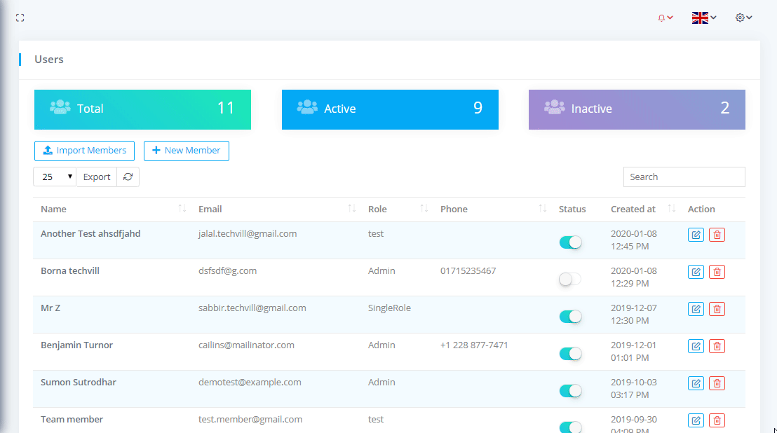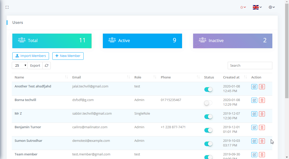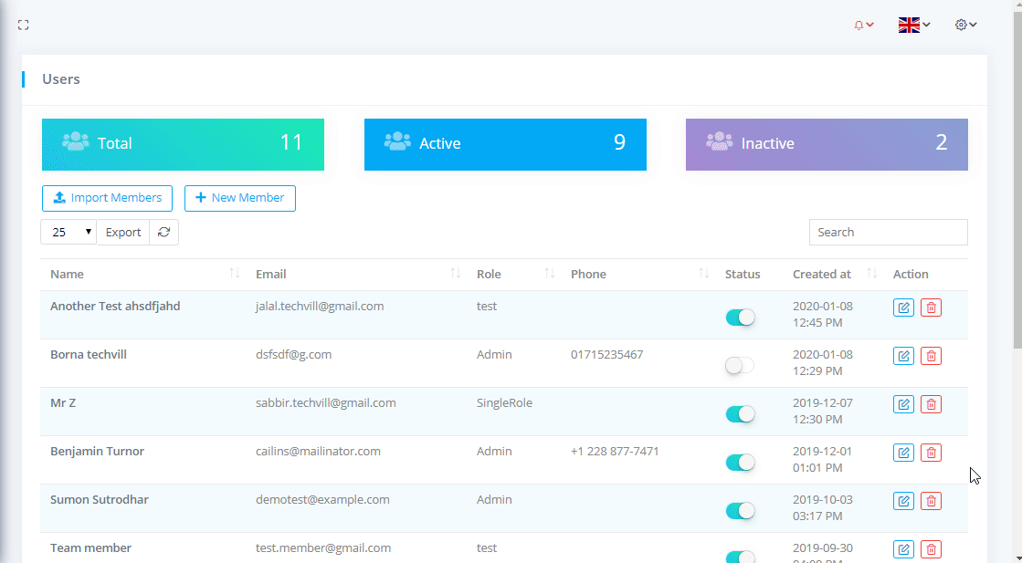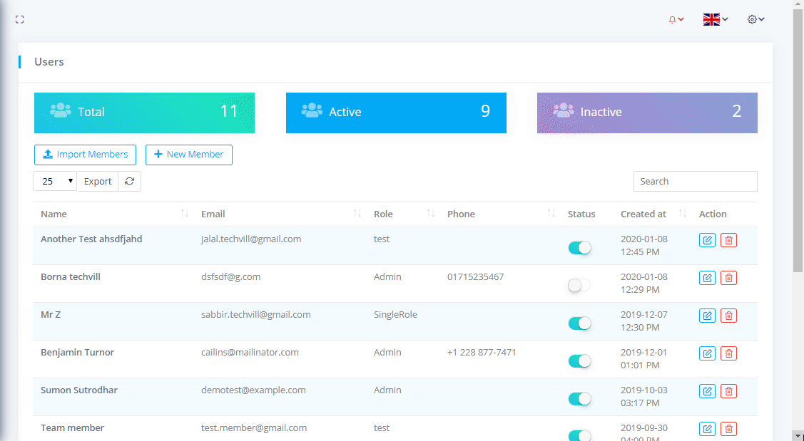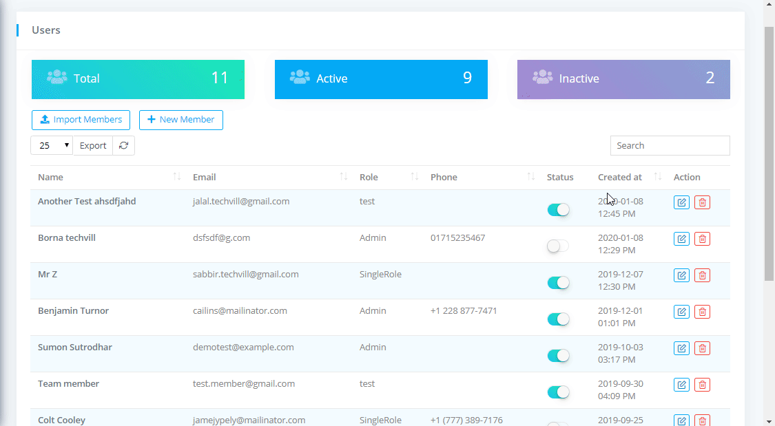 To view Team Members or Users List go to Relationships-> Team Members where you can see the all team members nd can download the list as PDF or CSV file by clicking on Export button. You can also see the Total team members with Active and Inactive members.