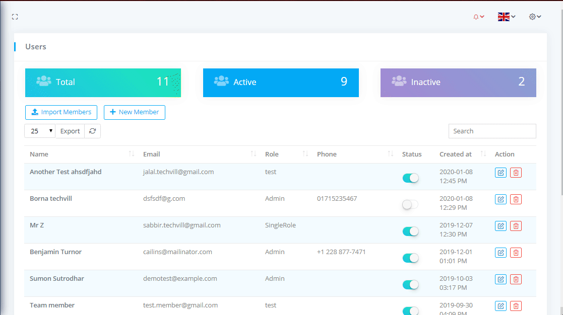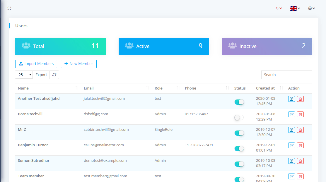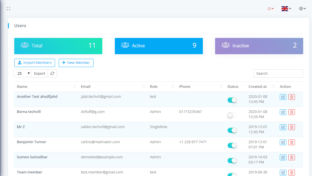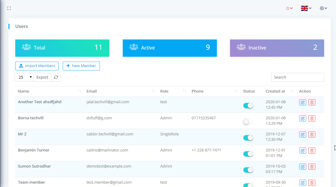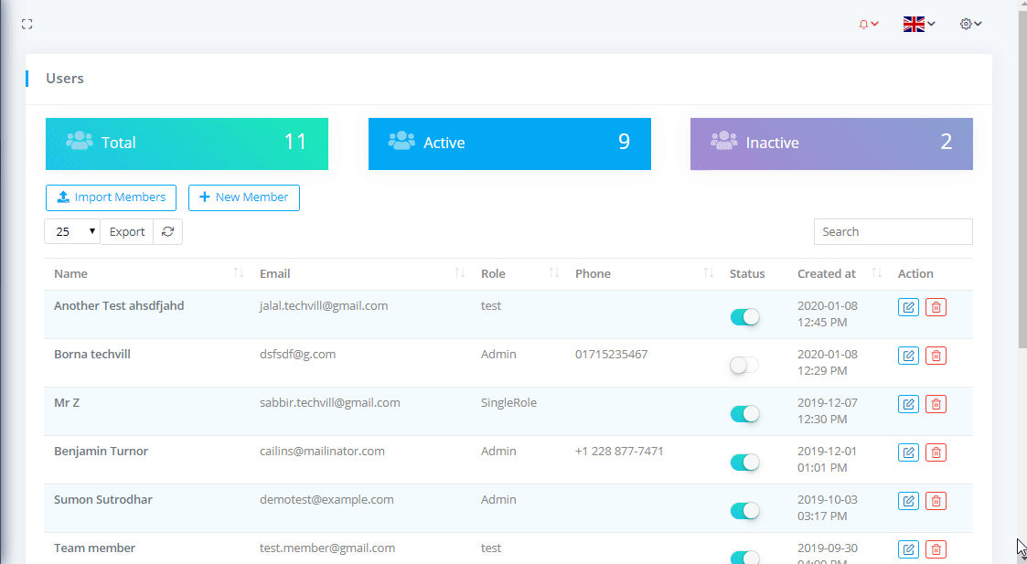 To view Team Members or Users List go to Relationships-> Team Members where you can see the all team members nd can download the list as PDF or CSV file by clicking on Export button. You can also see the Total team members with Active and Inactive members.