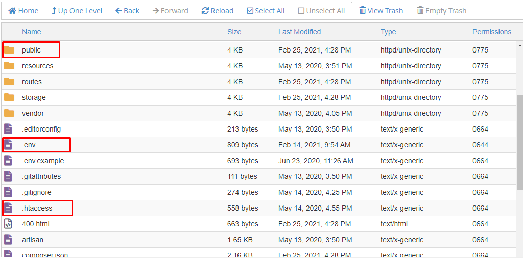 Select all the files and folders except .env file .htaccess & public folder and then delete the selected files.